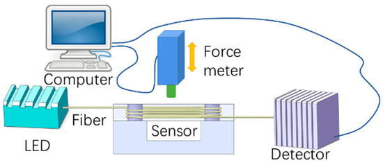 A simple source–fiber–photodetector system is assembled to calibrate the contact force. The light source is a white LED source (Thorlabs MWWHF2, Thorlabs, Newton, NJ, USA). The fiber is a piece of polymer optical fiber (PMMA) with a diameter of 480 μm and an attenuation of 0.3 dB/m (Dasheng D500, JiangXi DaiShing POF Co., Ltd, Ji’an, China). The matrix of the composite is made of PDMS (Dow Corning SYLGARD 184, Dow Corning, Midland, MI, USA) within a mold. The mix ratio of the base elastomer and the curing agent is 10:1. The curing temperature and time are 60 °C and 120 min, respectively. The photodetector is a power meter with a probe (Thorlabs S142C, Thorlabs, USA) which can receive light with a wavelength range from 350 nm to 1100 nm. The experimental setup is shown in Figure 3. To compare the influence of the base on the sensor, samples with/without a base were manufactured as shown in Figure 1b. The two schemes represent two different installation conditions in practical applications. The force meter is used to load the contact force which is controlled precisely by the computer. In addition, the displacement of the force meter and the power received by the detector are recorded by the computer synchronously.