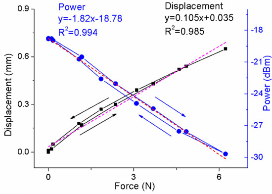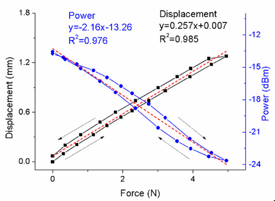 A loading/unloading experiment is implemented to test the sensitivity and hysteresis. Figure 4 shows the results of the sensor without the base. The black and blue curves represent the displacement and the power change as the contact force changes, respectively. When the probe of the force meter moves down, both the displacement and the force increase; however, the power decreases. The displacement and the power change almost linearly as the force increases. The sensitivity of power to the force is −1.82 dBm/N. For a power meter with a resolution of 0.001 dBm, the sensor can theoretically distinguish a minimal force change of 0.55 mN. The sensitivity of displacement to the force is 0.105 mm/N, which is determined by the elastic modulus of PDMS. In the experiment, both the power curve and the displacement curve show a slight hysteresis. It is caused by the stress relaxation of polymer material. In the loading and unloading process, the material undergoes different relaxation processes. This phenomenon will cause measurement errors. From the experimental data, we can calculate that the maximum error is no more than 0.2 N and the maximum error occurs when the force is about 3 N.