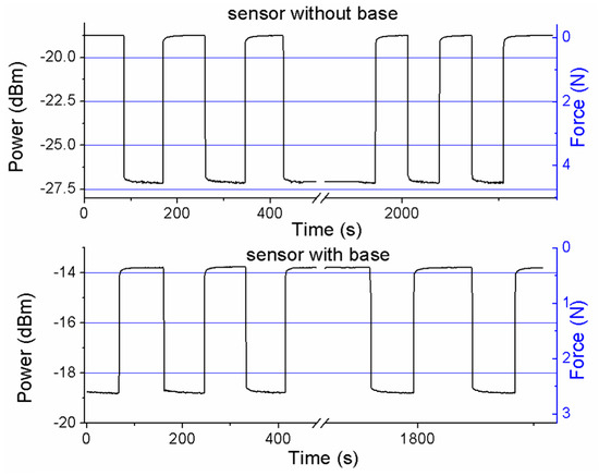 In industrial applications, repeatability is the most important characteristic. Force cycling tests are implemented. The experiment was conducted with a cycle of 200 s, and lasted for 12 h, with the number of cycles exceeding 216. The results of the two samples are shown in Figure 7. Both sensors with the base and without the base show high repeatability. In tens of cycles, the baseline and response line remain straight. The high repeatability benefits from the simple LED–fiber–photodetector structure and composite material package.