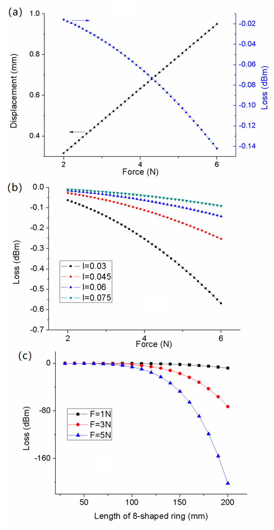 (a) The displacement and the loss change as the force increases; (b) The loss changes as the force changes for different section moment inertia values I; (c) The influence of the length of the 8-shaped ring on the loss.