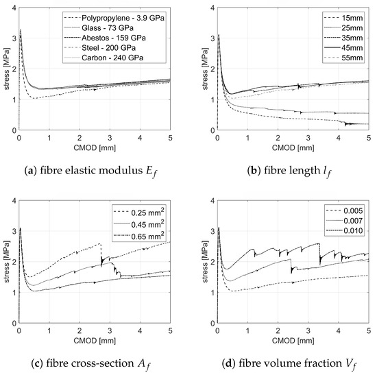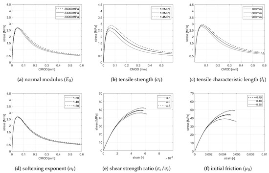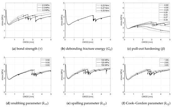 In the LDPM-F, the fibre–matrix interaction mechanisms are governed by (i) bond strength , (ii) debonding fracture energy , and the following four material parameters: (iii) , which governs the pull-out hardening, (iv) , (v) , and (vi) , which account for snubbing, spalling and Cook–Gordon effects, respectively. In Figure 4, the results of the sensitivity analysis are shown.