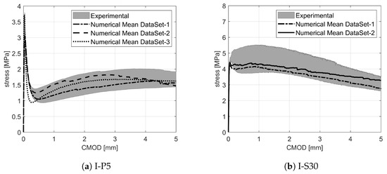 The well-known Cook–Gordon effect is accounted for through the parameter . Cook and Gordon predicted that a matrix crack approaching an isolated fibre can cause interface debonding before the crack tip reaches the fibre–matrix interface, if the interfacial strength is adequately weak [71]. This phenomenon, referred to as the Cook–Gordon effect, implies an additional fibre slippage. In the LDPM-F, the above-mentioned additional slippage is referred to as . This process creates an increment in the crack opening, and the value of is estimated as