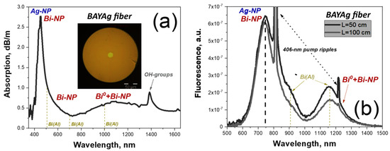 The fiber’s core diameter and N.A. were measured as 12.6 µm and 0.19, respectively. The fiber is strongly multimode within the entire VIS-NIR range as its cutoff wavelength is ~3.14 µm. Its absorption and fluorescence spectra (at ~10 mW excitation using a fibered laser diode (LD) emitting at 406 nm) for two lengths are shown in Figure 1a,b, respectively; the cross-sectional image of the fiber at white-light illumination is in the inset of Figure 1a. One can reveal from the spectra that there are contributions in the fiber’s absorption/fluorescence stemming from doping with Bi (Bi0 or/and its agglomerates, e.g., NPs, and Bi-Al BAC (see, e.g., [24,36,37]) and Ag (presumably entering the fiber core in the form of Ag-NPs) (see, e.g., [19]).