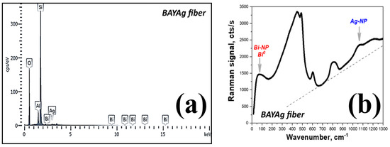 (a) X-ray ED spectrum for BAYAg fiber and (b) its Raman spectrum.