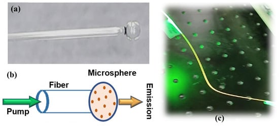 The resulting component can be addressed as a nearly spherical (slightly elliptical) cavity with a radius of ~300 µm. In Figure 4a, we show a schematized view of our RFL based on the design described above. The light from a pump laser (a fiberized LD at “green” wavelength) was launched through the splice into the fiber from the side opposite to the one where the microsphere was manufactured, so it first propagated along the entire fiber length and then within the microsphere, interacting with the dopants and igniting down-converted emission, the spectrum of which is in the orange–yellow region.