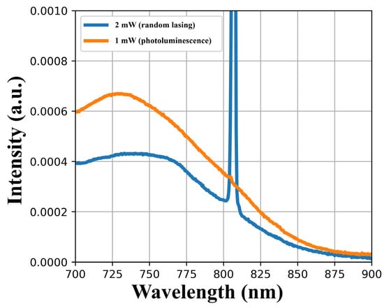 Figure 5 shows the spectral behavior of the system at passing through the laser threshold. The figure clearly shows an abrupt transformation of the optical spectrum from the spectrally smooth fluorescence centered at ~730 nm (see the orange spectrum, captured at pump power of ~1.5 mW) to the narrow-line (~1.5 nm in FWHM) lasing at ~807 nm (see the blue spectrum, captured at pump power of ~2.0 mW). First, note the tremendously growing laser line’s amplitude after passing the threshold and the simultaneously occurring depression of the remnant broadband fluorescence on its background, which is apparent from a comparison of the two spectra. This behavior appears to provide strong evidence for true lasing to arise in the system. Second, note that the drawn effect of the self-started lasing never happened when we attempted using ‘naked’ BAYAg fiber (i.e., without a microsphere on-tip); this proves the key role of the microsphere as an essential device element providing RL in our case. Third, note that remained “under-threshold” orange fluorescence (refer to the orange curve in Figure 5) itself is spectrally narrower than the one shown in Figure 1b; this shows that it is mainly produced in the microcavity, in the effect of whispery modes developing inside the latter.