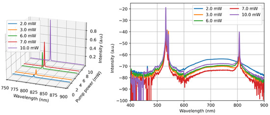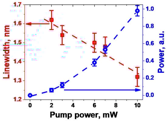 Figure 6 demonstrates the laser spectra measured at the system output. For all 532 nm pump powers explored (up to 10 mW), the narrow-line (~1.6, …, 1.3 nm in FWHM) light at the unchanged central wavelength (807 nm) with steadily growing (at increasing the pump) amplitude is generated. The power and the FWHM of the output laser light in the function of the pump power are presented in Figure 7. The behavior of the output power vs. pump power (nonlinear growth) is typical for laser action; accordingly, linewidth steadily decreases at increasing pump power.