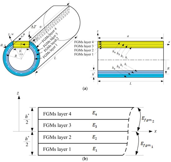 Four layers of FGM-coupled plate and circular shell for (a) thick FGM-coupled plates and circular shells with four layers and (b) Young’s modulus in four layers.