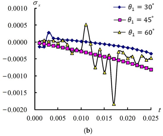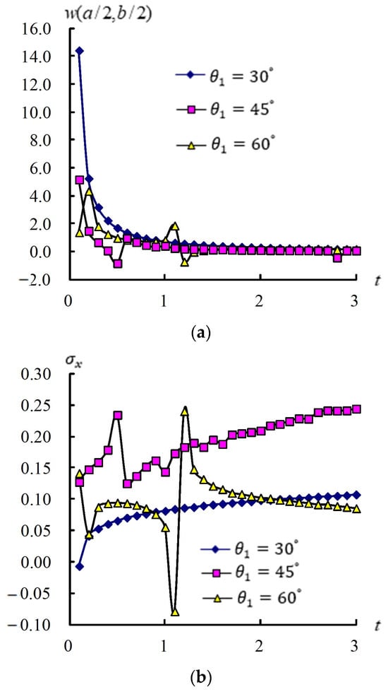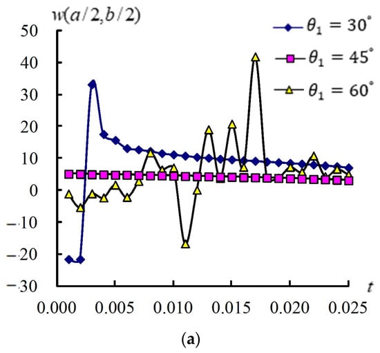 Figure 3 shows time responses for (a/2, b/2) and (GPa) in the coupled plates and circular shells with four layers, L/ = 5, = 0.925925/mm2, = 1, T = 600 K, = 100 K, and t = 0.1 s–3.0 s. The response values of (a/2, b/2) versus t under = , and , respectively, are shown. The maximum value of (a/2, b/2) is 14.420517 mm found at t = 0.1 s under = . The (a/2, b/2) values have converging tendencies that converged to 0.163256 mm under = , converged to 0.064898 mm under = , and converged to 0.140482 mm under = . The time responses of on the center of inner surface are shown. The maximum value of is 2.441 × 10−1 GPa, which occurs at t = 3.0 s under the = case. The values of demonstrate small oscillation during the period t = 0.5–0.6 s, then converge to 2.4418 × 10−1 GPa for = , slightly increasing to 1.0726 × 10−1 GPa for = and demonstrating small oscillation during the period t = 1.1–1.2 s, then decreasing to 8.5184 × 10−2 GPa for the = case. There are small peaks in the responses of (a/2, b/2) and for the angle = due to a greater width effect of plates.