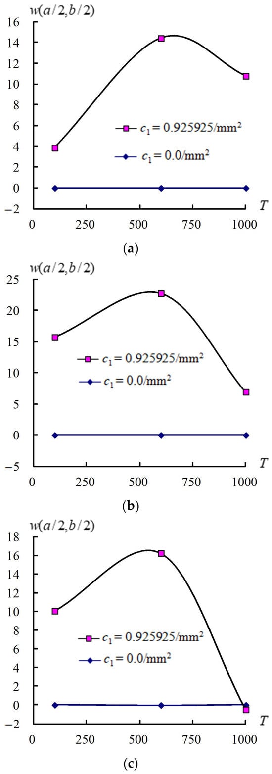 Figure 4 displays response values for (a/2, b/2) vs. T under 100 K, 600 K, and 1000 K with for 1, 2, and 3 at t = 0.1 s for = 0.925925/mm2 and for = 0/mm2, respectively, in coupled plates and circular shells with four layers, L/ = 5, = 100 K under = . Responses of (a/2, b/2) compared to T under = 0.925925/mm2 and = 1 case are shown, and the maximum of (a/2, b/2) is 14.420517 mm found under T = 600 K. Values in (a/2, b/2) increased from 100 K to 600 K then decreased from 600 K to 1000 K. The (a/2, b/2) amplitude in = 1 under = can withstand higher T = 1000 K. Responses of (a/2, b/2) compared to T for = 0.925925/mm2 and = 2 case are shown, and the maximum of (a/2, b/2) is 22.746904 mm found under T = 600 K. Values in (a/2, b/2) increased from 100 K to 600 K, then decreased from 600 K to 1000 K. The (a/2, b/2) amplitude in = 2 under = can withstand higher T = 1000 K. Responses of (a/2, b/2) verse T for = 0.925925/mm2 and = 3 case are shown, and the maximum of (a/2, b/2) is 16.266580 mm found under 600 K. Values in (a/2, b/2) increased from 100 K to 600 K, then decreased from 600 K to 1000 K. The (a/2, b/2) amplitude in = 3 under = 0.925925/mm2 and = success for higher T = 1000 K. All (a/2, b/2) amplitudes under = 0/mm2 are in constant small values.