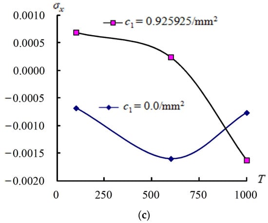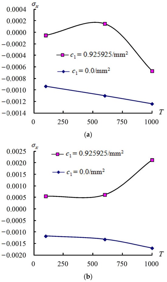 Figure 5 shows the values on the center of the outer surface vs. T for (1, 2 and 3) at t = 0.1 s for = 0.925925/mm2 and for = 0/mm2, respectively, in coupled plates and circular shells with four layers, L/ = 5, = 100 K under = case. The curves of vs. T under = 1 case are shown, the absolute maximum value of is 1.2357 × 10−3 GPa occurs at T = 1000 K under = 0/mm2. Values in increased from 100 K to 1000 K for = 0.925925/mm2 and = 0/mm2. The stress of = 1 under = cannot succeed on T = 1000 K. The curves of vs. T under = 2 case are shown, and the absolute maximum value of is 2.1249 × 10−3 GPa, which occurs at T = 1000 K under = 0.925925/mm2. Values in increased from 100 K to 1000 K for = 0.925925/mm2 and = 0/mm2, respectively. The values of = 2 under = cannot succeed on T = 1000 K. The curves of vs. T under = 3 case are shown, and the absolute maximum value of is −1.6276 × 10−3 GPa, which occurs at T = 1000 K under = 0.925925/mm2. Values in decreased from 100 K to 600 K and increased from 600 K to 1000 K under = 0.925925/mm2. The values of = 3 under = 0.925925/mm2 and cannot succeed on T = 1000 K. Values in increased from 100 K to 600 K and decreased from 600 K to 1000 K under = 0/mm2. The values of = 3 under = 0/mm2 and can succeed on T = 1000 K.