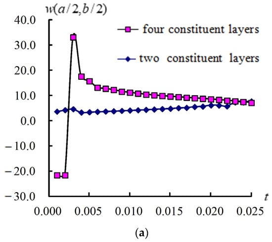 The compared (a/2, b/2) responses in transient data under , , and , respectively, for two and four layers are shown in Figure 7. Transient (a/2, b/2) data for four layers are greater than that for two layers under the case. The compared transient responses of under cases in , , and , respectively, for two and four layers are shown in Figure 8. The transient values of for four layers are smaller than that for two layers under case.