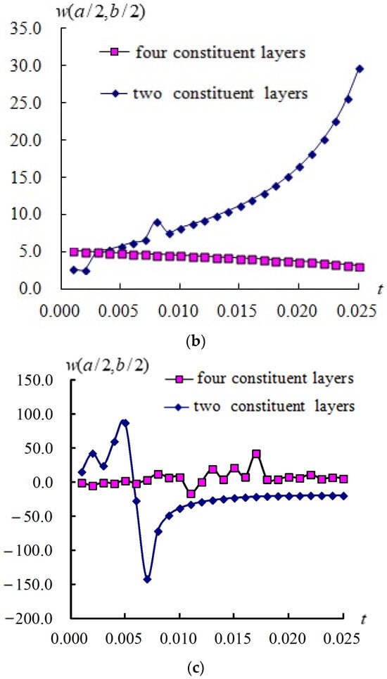 Compared transient (a/2, b/2) (mm) for two and four layers under (a) ; (b) ; (c) .