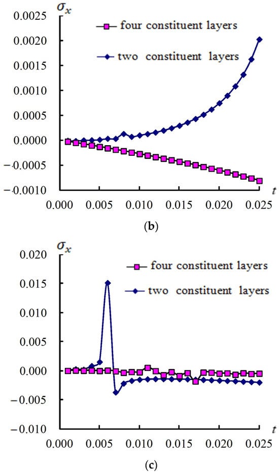 Compared transient (GPa) for two and four layers under (a) ; (b) ; (c) .