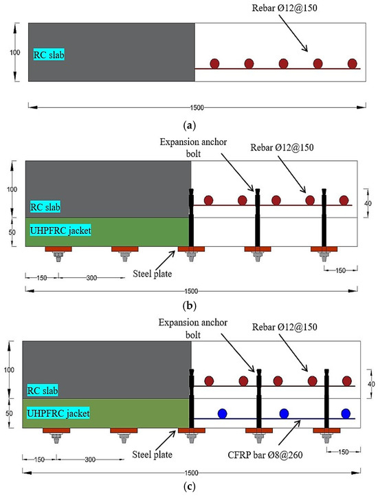 The experimental research included one control slab (SB1) and two RC slabs (SB2 and SB3) strengthened by the UHPFRC layer in the tension zone. The external UHPFRC jacket of the strengthened SB3 slab was reinforced using CFRP rods. As plotted in Figure 3, the dimensions of the slabs were 1500 × 1500 × 100 mm, with an effective length of 1300 mm. The reinforced concrete slabs are designed according to EC2 and ACI-318-08. SB2 and SB3 were jacketed with a 50 mm thick exterior UHPFRC layer. A 12 mm monolithic steel reinforcing mesh was used, with an effective depth of 75 mm. The effective depth of the expandable anchor bolts was 90 mm, with 40 mm implanted inside the NSC layer and 50 mm in the UHPFRC jacket, as shown in Figure 3. The mechanical anchorage system was placed a distance of 400 × 300 mm away in the two opposite directions. The slabs were built and subjected to incremental periodic (half-cycle) loads.