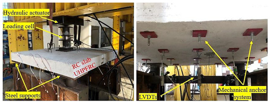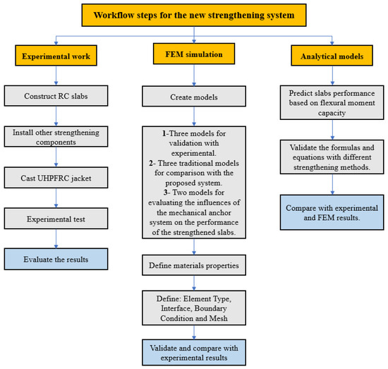 The mechanical anchor systems in this study have two main components: expansion anchorage bolts and a high-steel plate. The interface contact that occurs between the slabs and the UHPFRC jackets depends on the anchor system and the distance between the slabs and jackets, so these factors should be selected appropriately. Therefore, to ensure secure binding and fulfil the necessary resistance requirements, we used a 160 mm long mechanical expansion anchor bolt that was 12 mm in diameter, with a distance from the mechanical anchorage system of 400 × 300 mm in the two opposite directions, as demonstrated in Figure 1. Twenty 40 mm deep expansion bolts were implanted into the undersurface of each specimen. Furthermore, the presence of a high-steel plate in the mechanical anchor system allowed for an even distribution of applied forces across the RC slab surface and prevents localizing stress concentrations, reducing the possibility of early failure and deformation of the slab. The steel plates were designed according to ASTM A29 [33]. The steel plates had dimensions of 80 × 80 mm and were 10 mm thick, with a 12 mm circular hole in the center. Figure 4 provides a workflow of the steps of the newly proposed strengthening technique.