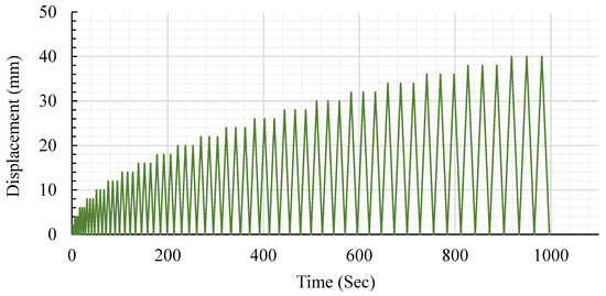 Figure 5 depicts the setup and instruments pertaining to the testing specimens. As shown in Figure 6, we used three electronic linear variable differential transducers (LVDTs) at the center to estimate the deflections of the slab at each quarter. The slabs were supported by square steel plates measuring 200 × 200 mm on all four edges. The distance between each support was 1300 mm, measured from center to center. A hydraulic actuator jack (MTS) equipped with a valve servo capable of withstanding loads exceeding 1000 KN was utilized to apply a periodic load (half-cyclic load). The actuator jack was actuated using a Shimadzu-4830 servo smart controller. Furthermore, cyclic loads were applied on a square steel plate in the upper middle of the RC slabs, as depicted in Figure 6. The load was generated through the application of pushing and releasing phases, enabling the loading cell to revert back to its original position at an equivalent loading rate. The loading methodology for the slab was determined based on the guidelines set by the ACI Committee 374.1-05 (ATC-1996). To achieve a consistent response, the displacement was iteratively repeated three times, and a loading rate of 2 mm/s was applied. Figure 7 illustrates the half-cyclic loading protocol.