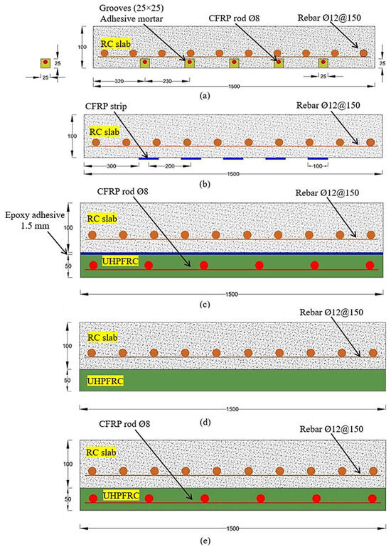 Details of strengthening slab techniques (note: all dimensions are in mm): (a) near-surface-mounted (NSM) CFRP rods; (b) attached CFRP strips; (c) externally jacketed UHPFRC using epoxy adhesive bonding, and (d,e) externally jacketed UHPFRC without a mechanical anchor.
