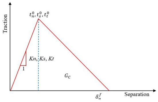 Figure 10 displays the stress–strain relationship regarding the reinforcing steel and CFRP (bars and strips). In this investigation, the reinforcing steel bars, steel plate loading, and steel supports were modelled using linear–elastic–plastic models and strain hardening. However, the CFRP (rods and strips) material was simulated utilizing an isotropic linear–elastic model [52]. The compressive strength of CFRP was not taken into account in the modelling. The epoxy adhesive model was designed with a bilinear traction separation law for cohesive behavior and a specific interface element thickness to depict the transitional region between NSC and UHPFRC layers. Figure 11 illustrates the traction separation constitutive properties, and Table 5 shows the cohesive interface element properties for the epoxy layer utilized in the SB-E specimen. The parameters of the cohesive interface (K n, K s, and K t) are the standard and tangential stiffness elements that relate to shear detachment across the interaction face before the beginning of damage. tn, ts, and tt illustrate the maximum traction peak stresses in the normal shear and tangential orientations. Table 2 depicts the mechanical characteristics of the rebar steel, adhesive mortar, and CFRP that were used in the FE models.
