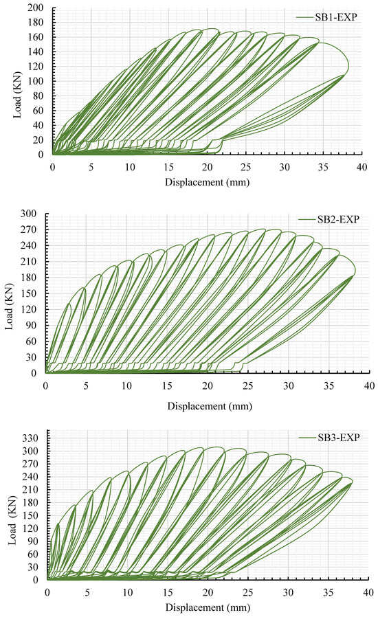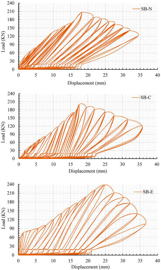 The SB-N, SB-C, and SB-E strengthened slabs exhibited a combination of flexural and premature debonding due to increased compressive stress at the interface contact surface between NSC and epoxy adhesive, as shown in Figure 18. For SB-N, premature debonding between the adhesive mortar and RC slab occurred in the center of the slab when the cyclic loads reached 0.75 times the ultimate load. Flexural cracks were observed on all sides of the slabs, as indicated in Figure 18. Compared to experimental slab SB3, the peak load of strengthened slabs SB-N, SB-C, and SB-E decreased by 91 kN, 100 kN, and 61 kN, respectively. Otherwise, the deflection at maximum load of the SB-N, SB-C, and SB-E strengthened slabs resulted in a decrement of 24%, 29%, and 17%, respectively, as shown in Figure 19. Additionally, the stiffness of the strengthened slabs modified using the near-surface-mounted (NSM) CFRP rebar approach, the externally attached CFRP strips approach, and the approach involving the use of the epoxy adhesive method to bond the UHPFRC jacket reinforced with CFRP rods decreased by 16%, 17%, and 8%, respectively, compared to that for experimental slab SB3 that was modified using the newly proposed strengthening system, as depicted in Figure 19.