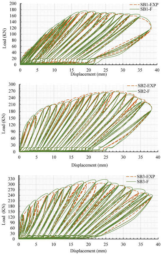 In addition, two slab models, namely, SB-U2 and SB-U3, were developed to evaluate the influences of the mechanical anchor system on the performance of the retrofitted slabs. These models were designed in the same manner as the strengthened experimental slabs (SB2 and SB3) except for the fact that they did not have a mechanical bonding system. The impact of the mechanical anchor approach was assessed through three concepts: the increase in loads, stiffness, and the interaction contact surface between the NSC and UHPFRC layers. In comparison to experimental slabs SB2 and SB3, the peak loads of the SB-U2 and SB-U3 models decreased by 24% and 30%, respectively, as shown in Figure 19. Meanwhile, the stiffnesses of the SB-U2 and SB-U3 models were 8.7 kN/mm and 9.8 kN/mm, reflecting a reduction in the stiffness of the models by 12% and 34%, respectively, in comparison with the experimental retrofitted slabs. Furthermore, the coefficients of variation between the practical and SB-U2 and SB-U3 models’ outcomes in terms of the ultimate load were 11.4% and 15.8%, respectively, as demonstrated in Table 7. Figure 18d,e, reveal that the two slab models strengthened without a mechanical system displayed notable high-strain behavior concentrated in the center of the slabs and the interface between NSC-UHPFRC layers. Besides that, the SB-U2 and SB-U3 models experienced failure due to debonding between the NSC-UHPFRC layers on all four sides of the specimens, as depicted in Figure 18d,e. Therefore, it can be concluded that the impact of the absence of a mechanical anchor system in these two models reduced the peak loads and the rigidity of the slabs and increased the probability of occurrence of debonding failure. According to the results discussed above, the newly proposed strengthening method is more effective and efficient than the other strengthening systems examined in this study.