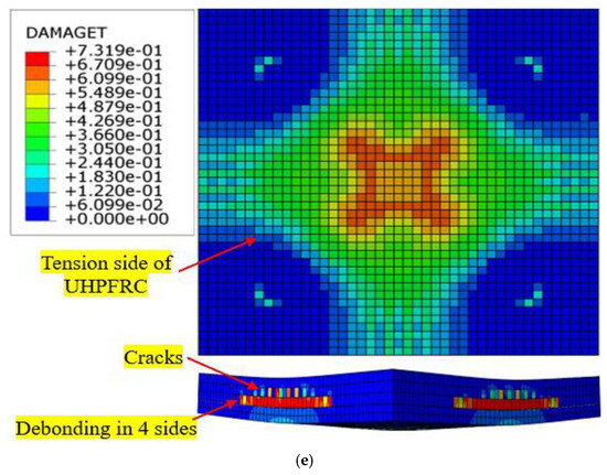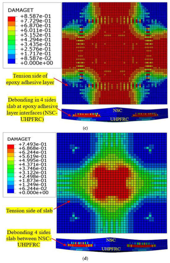 As a result of increased loads and environmental deterioration, the bearing capacity of reinforced concrete structures has reduced and may no longer meet service demands. Retrofitting is a commonly employed strategy for improving the structural resistance of RC elements [1]. The methods used to strengthen RC members typically involve a process of repairing and reinforcing existing structures to enhance their strength and durability and extend their service lives [2]. One often-used method of enhancing structural strength is to apply a layer of fresh reinforced or non-reinforced concrete in areas where the highest levels of stress occur. Nevertheless, the strength of structures fortified with normal-strength concrete (NSC) reduces over time [3]. This issue has provoked investigations into the use of advanced cementitious compounds to enhance structural concrete components. Ultra-high-performance fiber-reinforced concrete (UHPFRC) is a recently developed construction material that possesses exceptional compressive and tensile strength along with remarkable durability. This makes it highly desirable for many strengthening purposes [3,4,5,6,7,8,9,10]. The limited quantity of coarse aggregates, combined with a significant proportion of fibers (often 2 or 3% by volume), results in enhanced stiffness, strength, and flexibility [11]. In addition, UHPFRC has compressive and tensile strengths above 150 MPa and 7 MPa, respectively, surpassing those of normal strength concrete (NSC) [12]. Over the past few decades, there has been a great deal of research undertaken to examine the responses of RC elements that have been strengthened using UHPFRC, either through experimental work or numerical simulation studies [12,13,14,15,16,17]. Nevertheless, in most of these investigations, UHPFRC was utilized as a means of reinforcing existing RC structures. This was achieved either by pouring fresh UHPFRC layers or by attaching precast UHPFRC layers using epoxy glue [18,19,20,21]. Ahmed et al. [22] studied the flexural responses of reinforced concrete beams reinforced in the tension zone with a fresh UHPFRC jacket. Additionally, the researchers constructed a 3D model using finite element simulation. Before the pouring of the fresh UHPFRC layer, the bottom sides of the beams were roughened to a depth of around 2.5–5.0 mm. The FE model employed the surface-to-surface contact technique to facilitate interaction between the beam and UHPFRC layer. The outcomes demonstrated that the strengthened beams showed notable enhancements in stiffness, maximum load, and energy absorption. Yang et al. [23] investigated the use of a steel-reinforced UHPFRC jacket, a GFRP-reinforced UHPFRC layer, and a CFRP mesh to enhance the strength of pre-damaged full-scale hollow RC slab beams. The findings were derived by using a numerical analysis employing an implicit solution. A concrete-damaged-plasticity model (CDPM) was employed for simulating the UHPFRC. The tie approach was employed to depict the interaction between the CFRP mesh and the preexisting concrete. It was found that the finite element model neglected to account for the bond-slip that occurred between the individual components. The findings indicated a significant improvement in the maximum flexural capacity of the hollow slab beam when reinforced with a GFRP-reinforced UHPFRC layer and CFRP mesh, with increases of 47.1% and 41.2%, respectively. Zhang et al. [24] used a UHPC jacket to strengthen damaged RC beams. After subjection to preـdamage, the bottom faces of RC beams were cut to expose the coarse aggregate, which was then drilled to a 12 mm diameter and a 90 mm depth. High-strength bolts were then installed, and the holes were cleaned and filled with epoxy adhesive. The results showed the reinforced beam substantially increased crack resistance and maximum bearing capacity. Yoo et al. [25] examined the impact ratio of reinforced steel and steel fibers with respect to UHPC beams, indicating that rebar steel and steel fibers effectively enhanced crack-widening resistance and ductility. Based on the results obtained by Lampropoulos et al. [26], strengthening RC beams by placing UHPFRC layers at different places significantly improves both the ultimate moment capacity and yielding force for each of the reinforced beams. The corresponding investigations revealed that UHPC jacket thickness and the kind of retrofitting method employed have a substantial influence on stiffness, failure mode, ductility, and beam capacity [27]. RC slabs were strengthened with UHPFRC layers and reinforcing steel embedded within the UHPFRC. Testing was conducted, employing three-point loading. The findings indicated the generation of diagonal cracks in the RC slabs, observed as de-bonding in the interface contact between the UHPFRC and NSC layers, as documented by Yin et al. [28]. According to the conclusions of one study [20], slipping in the interaction between UHPFRC and NSC layers appeared during the loading process. Paschalis and Lampropoulos [29] used dowel connectors between the NSC and UHPFRC to prevent early debonding. Their study evaluated the effectiveness of employing a UHPFRC jacket on three sides. They found that employing UHPC jackets without the connectors (dowels) was efficient up to the limit of serviceability, at which point excessive slip values resulted in debonding and reduced beam capacity. Applying dowels increased the bond between the two concrete layers. Additionally, dowels inhibited the expansion of cracks in the tension zone of the beams. Said et al. [30] studied the impact of the strengthening technique, the ratio of fiber, and the thickness of the jacket on the strength shear of RC beams strengthened with a UHPFRC jacket. Direct pouring of UHPFRC (cast in situ) on the beam substrate enhanced the beam’s ductility, load capacity, and toughness to a greater extent than the anchoring approach. It increased the thickness of the strengthening layer of UHPFRC and the 