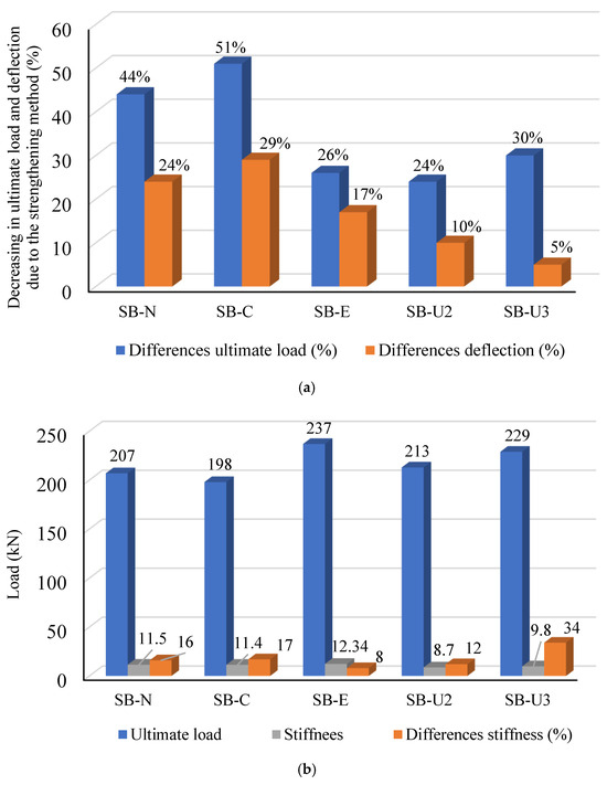 Comparison of strengthening methods based on experimental slabs SB2 and SB3: (a) differences in ultimate load and deflection of slabs retrofitted with various techniques and (b) ultimate load and stiffness of slabs strengthened with various techniques.