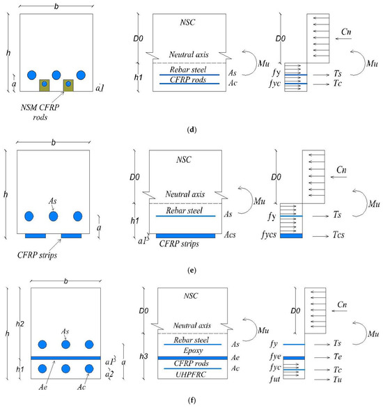 Analytical mechanistic models were employed to determine the flexural moment capacity of the RC slabs that were strengthened using various techniques. In this investigation, we utilized internal stresses derived from the basic plastic theory for composite materials to estimate internal forces. Flexural moments were calculated through the analysis of internal forces within the RC slabs at a certain cross-section in an equilibrium condition. Figure 20 depicts the schemes of all the analytical models of the RC slabs. According to the schemes of the analytical models, the reinforcing steel, CFRP bars, CFRP strips, and steel plates were supposed to be under tension, as depicted in Figure 20. Besides that, the epoxy adhesive mortar was neglected in the analysis. A Whitney stress block, which is a rectangular distribution of stress with comparable properties, was utilized to model the compressive behavior of NC in accordance with the specifications outlined in Section 10.2.7 of the ACI Code [59]. The value of [], representing the height of the NC at the compression region, is calculated based on equilibrium axial force [59], as described in Equations (14)–(19). The ultimate moment capacities of the slabs were calculated by analyzing the interior forces acting on the neutral axis. Therefore, the flexural moment capability [Mu] for all methods of strengthening a slab can be expressed using Equations (20)–(25).