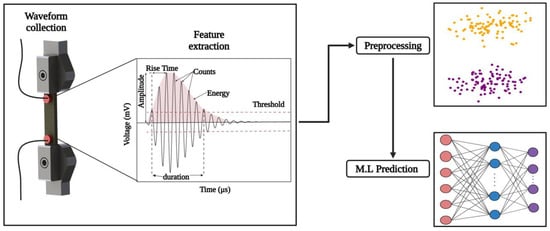 Tensile and flexural tests were performed on these biocomposite samples to evaluate their mechanical properties (Figure 1). An Instron LM-U150 electromechanical testing equipment with a 50 kN load capacity was used for these tests, which were carried out at room temperature. According to ASTM D638 standard [30], specimens with dimensions of 3.2 × 13 × 165 mm (H × W × L) were used for tensile testing. A crosshead speed of 1 mm/min was used, and strain measurements were collected with a 55 mm extensometer. The ASTM D790 [31] standard was followed for performing flexural testing on specimens measuring 3.2 × 13 × 80 mm (H × W × L), a crosshead speed of 2.5 mm/min, and a two-point bending arrangement with a 50 mm support span. Each test was repeated four times. Simultaneously, A two-channel physical data acquisition system (MISTRAS, Princeton Junction, NJ, USA) operating at a 4 MHz sampling rate with 40 dB pre-amplification was used for collecting acoustic emission (AE) data. Two resonant MICRO-80 sensors were used to detect AE signals from 100 to 1000 kHz with a 35 dB threshold to eliminate the noise. The steps for preprocessing acoustic emission data and preparing it for machine learning prediction are shown in Figure 2.