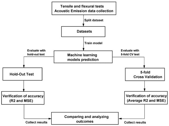 The RFR model achieved R2 values exceeding 0.98 and MSE as low as 0.013 for tensile stress prediction. The performance differences between tensile and flexural tests are notable; tensile tests provided richer AE data due to the distributed stress along the specimen, whereas flexural tests, where stress is concentrated in the fracture area, resulted in fewer AE events and higher error metrics. These observations indicate that while our models are effective for the current case study, further data collection is needed to ensure generalizability across different loading conditions.