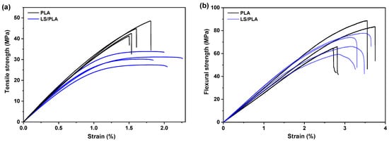 Typical stress–strain curves for the LS/PLA biocomposite and neat PLA specimens; (a) tensile test, and (b) flexural test.