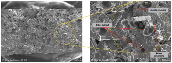 To validate the clustering-based classification, scanning electron microscopy (SEM) was employed to examine the fracture facies of tested specimens. Figure 5 illustrates the fracture surfaces of tensile-tested specimens, confirming the damage mechanisms identified through AE analysis. The observed fiber–matrix interactions, crack propagation, and fiber pull-out align with the AE-based classification, reinforcing the reliability of the clustering methodology.