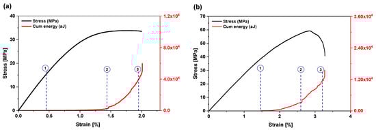 Stress–strain curves, as well as the cumulative acoustic emission energy, for the composite during tensile (a) and flexural testing (b).