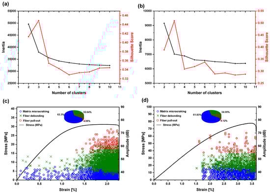 Silhouette width and elbow inertia for optimal cluster selection: (a) tensile test, (b) flexural test, (c,d) stress–strain curves with AE amplitudes classified by K-means for tensile and flexural tests, respectively.