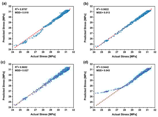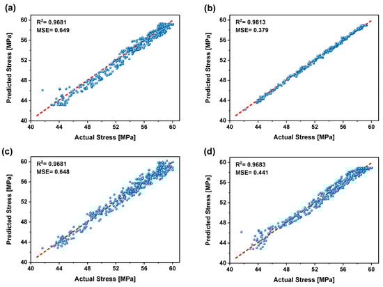 Stress levels estimated for tensile testing using ML models: (a) ANN, (b) RFR, (c) DTR, and (d) SVR. Blue dots represent the predicted stress values, while the red dashed line indicates perfect prediction—closer proximity to this line reflects better model performance.
