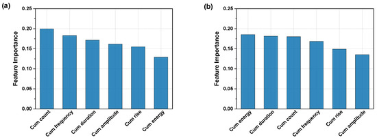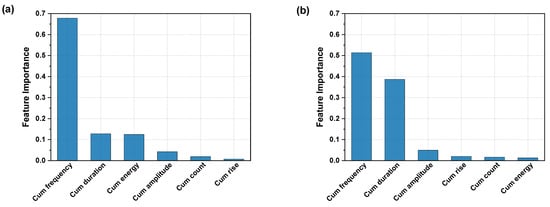 Feature importance analysis used in RFR and DT models revealed that specific AE features play a crucial role in stress prediction. In the RFR model, cumulative energy and count emerged as the most critical predictors, while the DT model indicated that frequency is the dominant feature.