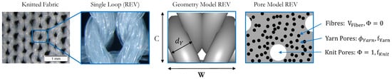 From these three volumes, , and , we can calculate the porosities of the yarn volume , the porosity of the REV , and the overall porosity of the fabric