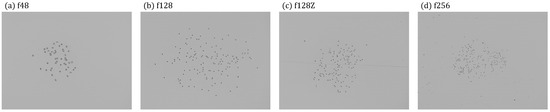 To validate the yarn model, four polyester TTYs were produced with approximately the same yarn count but different fibre counts. The yarns have 48, 128 and 256 individual filaments. The 128-filament yarn was additionally twisted with 200 TPM to give a compact, less porous yarn with similar fibres. The yarns were embedded in resin at a yarn tension of 0.5 cN and cross-grinded. Figure 2 shows microscope images of the yarn cross-sections with decreasing filament diameters from f48 to f256.