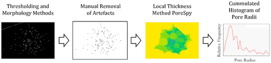 For the experimental determination of the porosity, density-based approaches are the most straightforward. Volumes are calculated by dividing the weight of the structure by the material density [8]. For the quantification of pore size, the interaction of the structure with fluids is mostly used. Examples for fluid-based methods for examining the PDF equivalent pore radii of fabrics are the adsorption of water [10], the intrusion of mercury [11], the intrusion of mercury and water [12], or the method of porosimetry, which uses the difference in permeation of a dry and wet sample [13]. Radiation-based imaging techniques, such as light microscopy, X-ray microscopy, tomography, and magnetic resonance imaging, can be used to extract high-resolution geometric information from porous media. Before the spread of tomography techniques, stereology was a separate science concerned with analysing the structure of materials from sectional images [14]. Today, image processing tools such as PoreSpy [15] or proprietary software such as GeoDict are used for analysing digital image files. These software tools can be used to efficiently analyse 2D images and 3D models with regard to pore properties, such as shape, connectivity, porosity, pore size distribution, and internal surface area.