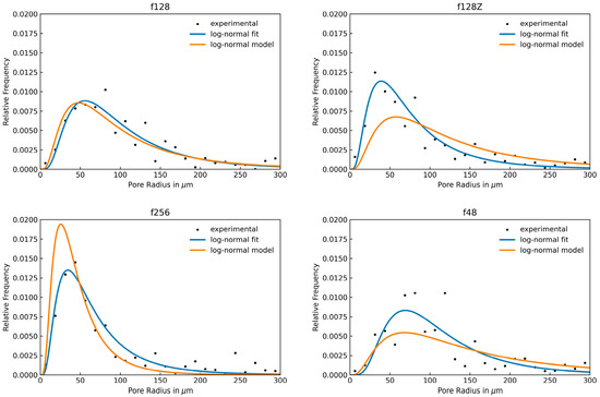 In general, the experimental data show high noise, especially for the f48, where fewer filaments are present in the cross-section. The noise is due to the comparably small number of images and the bin size. Table 3 shows the pore diameters obtained by the model and by fitting the experimental data to a log-normal function.