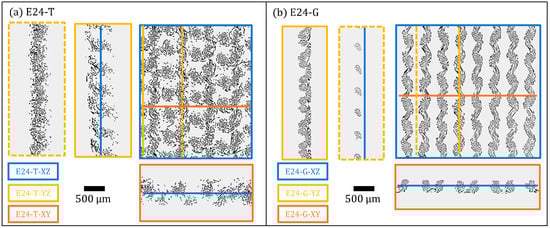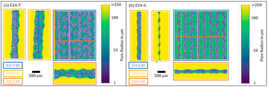 From the CT scans of the fabrics, sections of four loops in the wale and four loops in the coarse direction are extracted for analysis. Figure 6 shows examples of the CT slices obtained in the XZ directions of the fabric plane, the YZ plane in the coarse direction and the XY plane in the wale direction after thresholding. Due to the twist-texturing process, the loops of E24-T show a slight skew, whereas E24 shows no skew. Obviously, the inter-yarn pores are smaller in E24-T compared to E24-G. For the smooth yarn in E24G, the intra-yarn pores are comparatively small and compact.