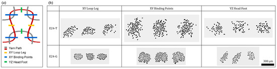 (a) Location of yarn cross-sections at the loop legs, the binding points and the loop heads. (b) Corresponding yarn cross-sections for both fabric types.