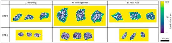 The yarns are more compact in the knitted fabric compared to the cross-sections in Figure 2. The texturized yarn with its larger yarn diameter opens larger pores in a wider distribution. For both E24-G and E24-T, the pore size decreases visibly at the binding points. At the loop heads and feet, the yarn shows an almost elliptical shape with smaller pores on the outside. At the binding points, the yarns of E24-T are not separable and form smaller pores in the centre, while the smooth yarn pores maintain their constant small size. Figure 8 shows the visualisation of the local thickness method on the selected yarn diameters; pore radii are shown from blue to yellow with increasing size, and fibres are shown in white.