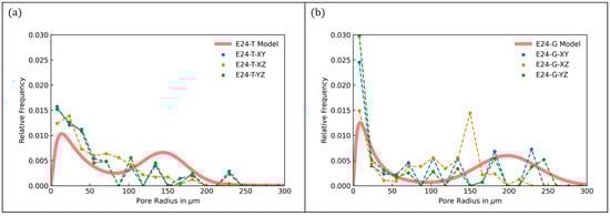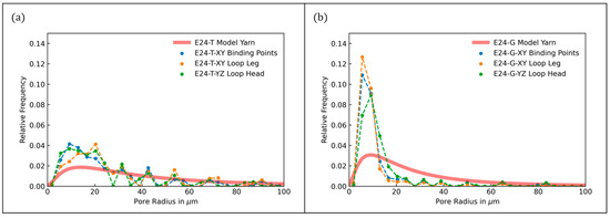 The pore size distribution function calculated by the model and the histograms of the local thicknesses are compared in Figure 9. The values of the local thicknesses have been arranged in 14 bins between 0 and 60 µm for each selected cross-section. E24-T shows a broader distribution than E24-G, both having a peak of distribution around 10 µm. The distributions of the specific yarn cross-sections are only slightly different and the loop leg measurements show slightly higher values for the loop legs for both fabric types. Both distributions show almost no values for very small pores < 5 µm. This is within the resolution of the images and, therefore, not surprising. Compared to the yarn model, the measurements show a qualitative agreement.