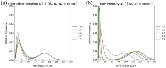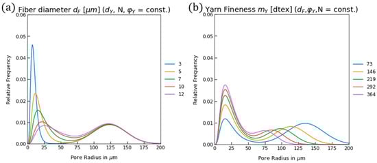 Although no work dedicated to modelling the intra-yarn pores in yarn-based textiles could be found, some work has been published on modelling the porous properties of random fibre networks, i.e., of nonwovens. Sampson developed a statistical model for the pore radius distribution in isotropic near-planar fibre networks [38]. Rawal discussed different pore size distribution models for nonwovens using a gamma function for fitting [39]. Bai et al. did something similar in 3D. They developed an extended model by superimposing existing models and mathematically deriving the overall PDF. His model generally agrees better with experimental data than mono-layer models. The experimental results show that the mean pore diameter shifts to larger values with increasing porosity and increasing fibre diameter. Another finding is that orientation has no significant effect on the PDF of nonwoven fibrous filters [40]. Wang and Schiller carried out investigations using pore network modelling of random fibre networks. They point out that the peak of the PDF becomes sharper with decreasing porosity, that pore diameter increases linearly with fibre diameter, and the pore connectivity decreases linearly with fibre diameter and increases with porosity in the range of their parameters [41].
