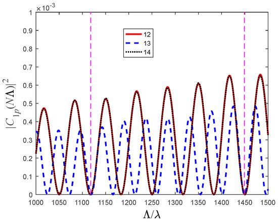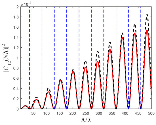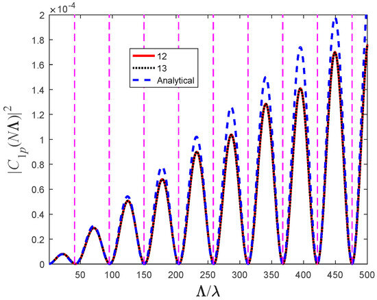 Figure 2 shows the transmission coefficient as a function of the ratio between the period and the optical wavelength for periods. As observed, the approximate expression (17) aligns closely with the exact numerical solution. Furthermore, the crosstalk suppression criterion (19) exhibits strong agreement with both the analytical and numerical results.