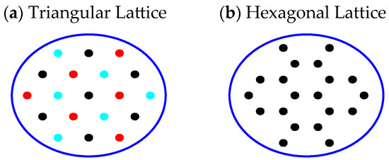 This criterion can eliminate crosstalk in 3-core fiber whenever the fiber length for any integer . However, it can be applied even for other cases, such as triangular lattices (see Figure 5a). The different colors represent cores with different profile phases, i.e., according to (21). Consequently, there are no adjacent cores with the same profile phases, and therefore the effective CP, i.e., identical profile phases, is increased by a factor of , therefore reducing the crosstalk substantially.