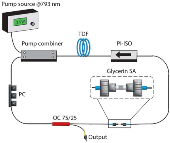 A Q-switched TDFL has been constructed to assess the efficacy of the glycerin-based SA around the 2-µm wavelength region. As illustrated in Figure 1, a 0.8-m double-clad Thulium-doped fiber (DCTDF, Nufern SM-TDF-10P/130-HE, East Granby, US) with inner cladding diameter of 130 µm, numerical aperture (NA) of 0.46 with cladding absorption of 9 dB/m at 793 nm, and core diameter of 10 µm with NA of 0.15, was utilized as the gain medium and pumped with a 793 nm laser source through a (2 + 1) × 1 pump combiner (Multimode pump & signal combiner). The signal input signal input and output were of type SM-GDF-10/130/-15FA and SM-GDF-10/130-15FA, respectively. A polarization-independent isolator (PI-ISO) was placed between the TDF and the SA to ensure unidirectional laser operation. A three-paddle polarization controller (PC) was inserted to optimize the Q-switched pulses, and a 75:25 optical coupler (OC) was spliced between the PC and the SA for measurements at the 25% output port. The glycerin-based SA was inserted between the 75% output port of the OC and the PI-ISO pigtail.