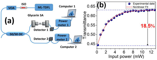 By optimizing the glycerin gap between the two FC/PC connectors, stable PQS operation of the TDFL was achieved. The nonlinear absorption of glycerin was then measured using a balanced twin detector system (similar to [14]), as illustrated in Figure 2a. The setup consisted of a homemade mode-locked TDFL with a central wavelength of 1996 nm, a pulse duration of 3.43 ps, and a repetition rate of 1.31 MHz [21], which served as the pump source. The laser output was coupled to a PI-ISO to prevent back reflections, followed by a variable optical attenuator (VOA) to control the input power. A 50/50 OC was employed after the VOA to split the optical power equally.