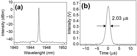 Figure 3 depicts the optical spectrum and the profile of the QS pulse corresponding to a pump power of 2.4 W. The central wavelength of the TDFL is shown in Figure 3a, located at 1946 nm with a measured 3-dB bandwidth of ~50 pm. Figure 3b displays the QS waveform, exhibiting a pulse duration of 2.03 µs.